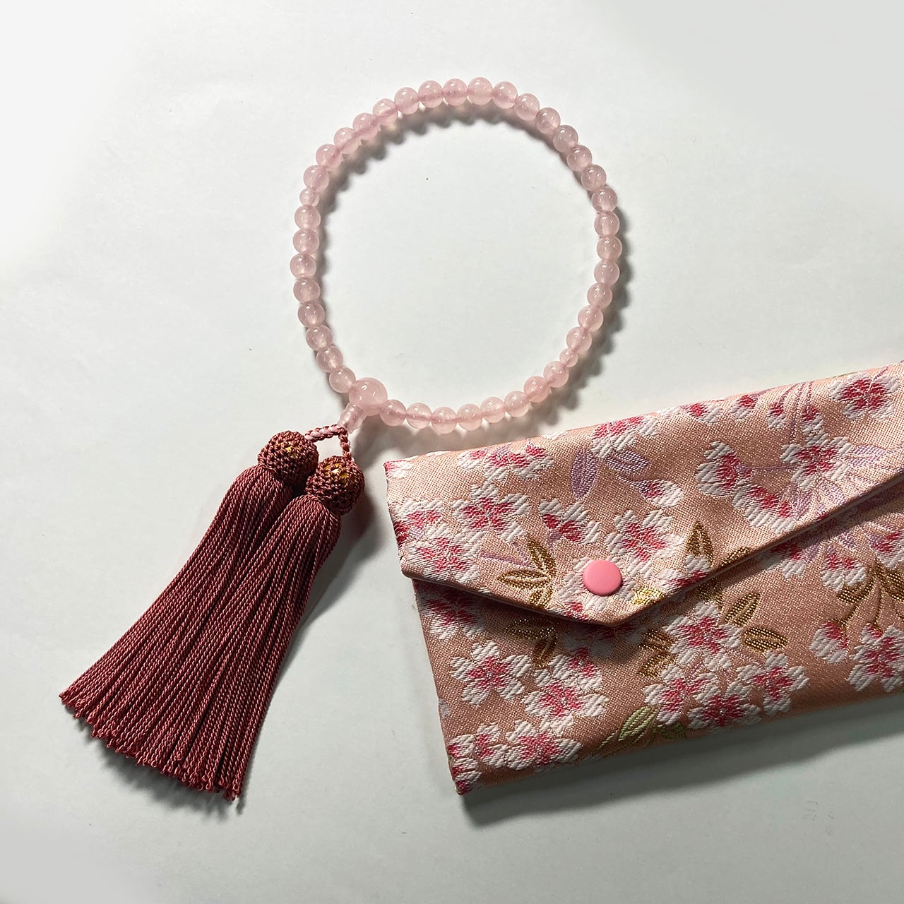 略式念珠 ローズクオーツ共仕立 正絹房 念珠袋付