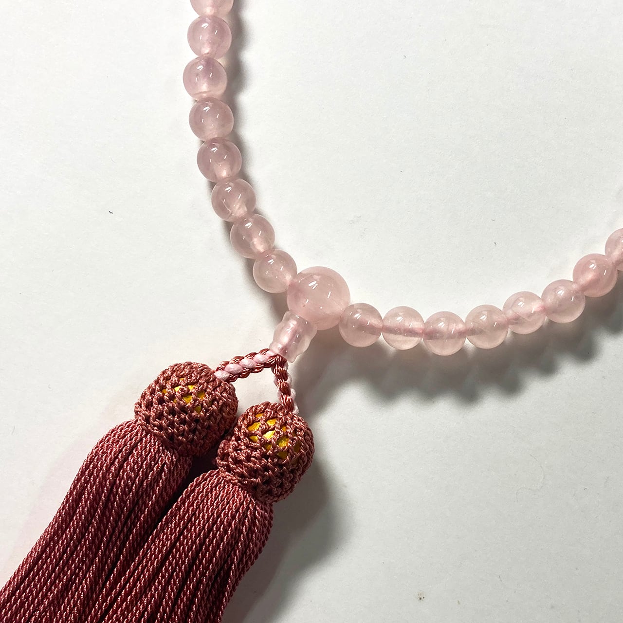 優しいピンク色が特徴的なローズクオーツ共仕立の念珠です