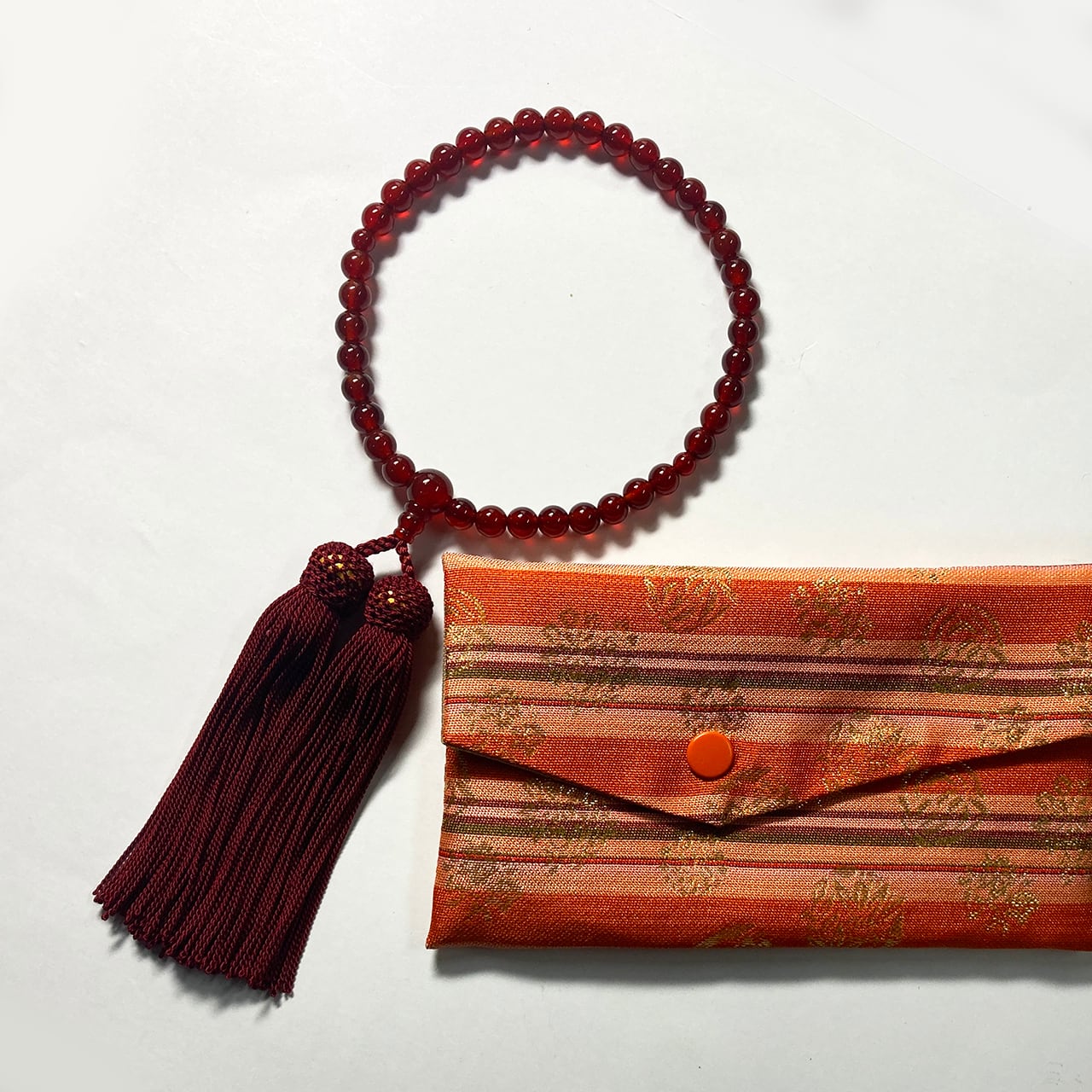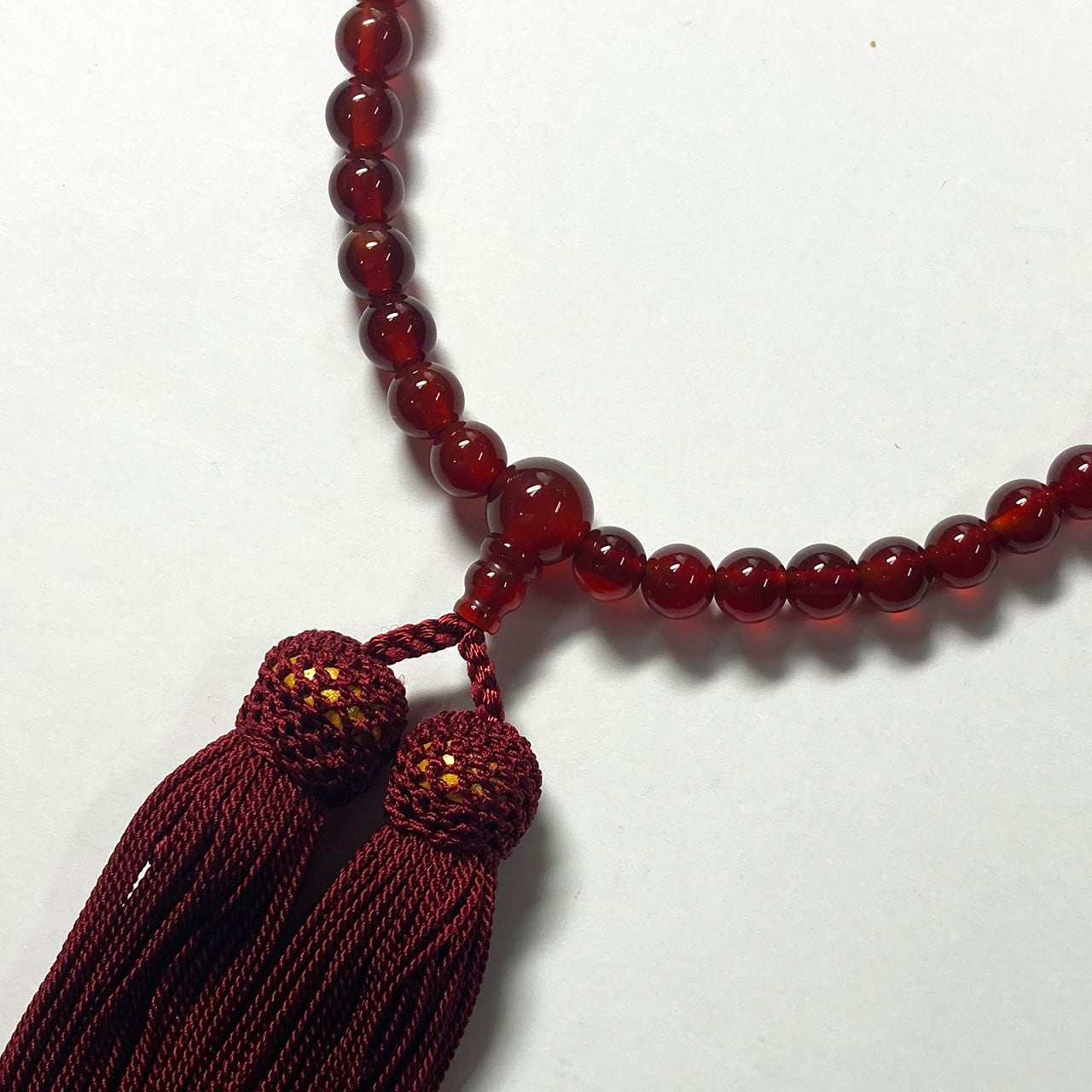 赤が際立つメノウ共仕立の念珠です