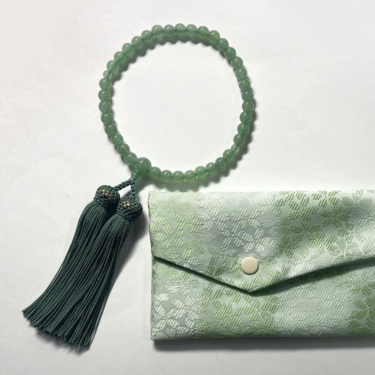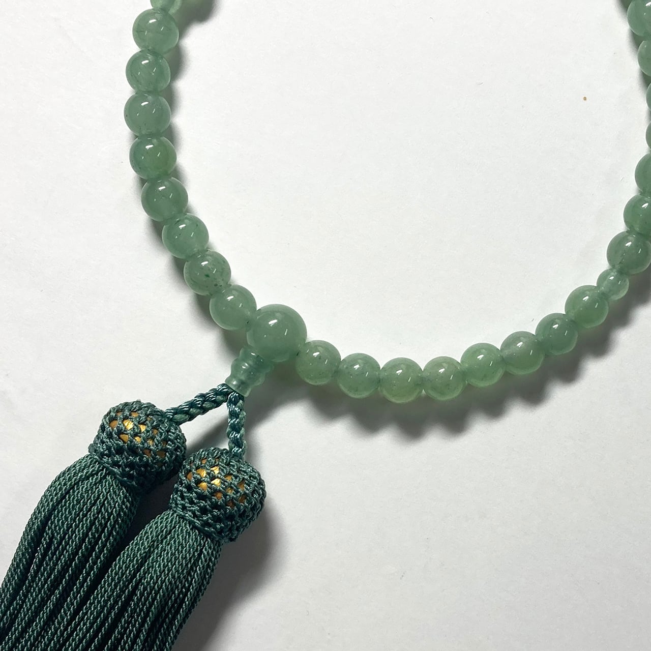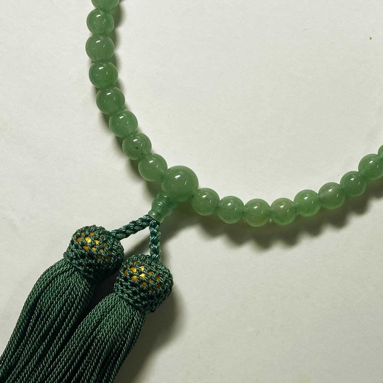落ち着いたグリーンが印象的なヒスイ共仕立の念珠です