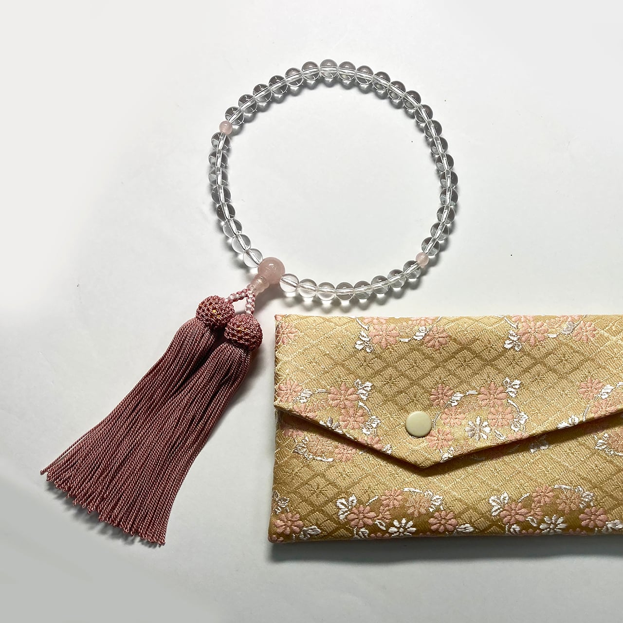 略式念珠 水晶ローズクオーツ仕立 正絹房 念珠袋付
